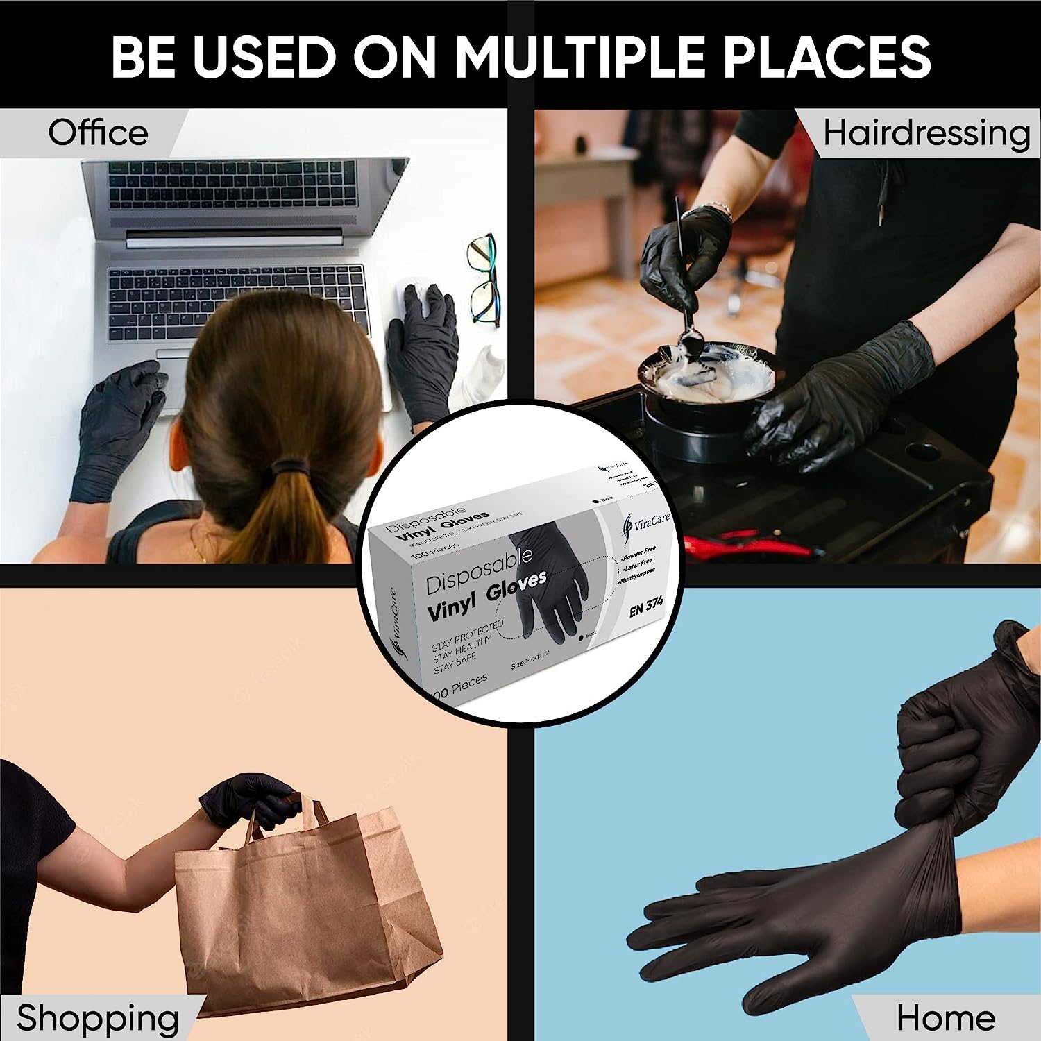 MULTI-FUNCTIONAL APPLICATION: Black vinyl gloves are best for laboratory work or examinations, safety, hair coloring, tattoos, food preparation, painting, cleaning, pet care, home decoration, arts and crafts, gloves latex free can only meet your needs.