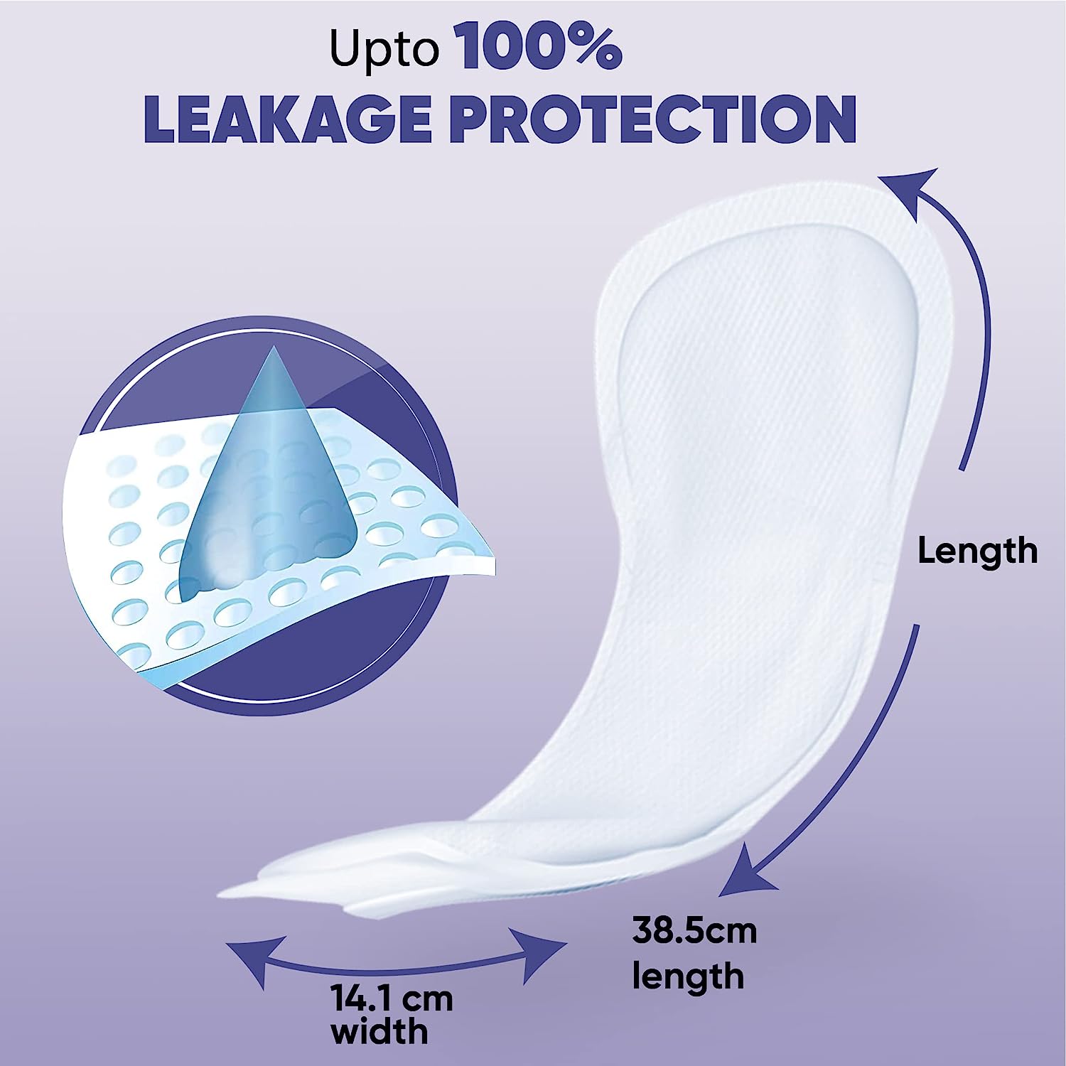 ANTI-LEAKAGE CUFFS: Our lady's pads for urinary incontinence are fully integrated with anti-leak cuffs in hydrophobic non-woven for optimal, reliable protection. Our night pads have quick diffusion of liquids in the centre of the core. In our incontinence pads, women have 100% waterproof polyethylene outer layer covered with a non-woven layer of polypropylene on all sides to prevent leakage of liquids.