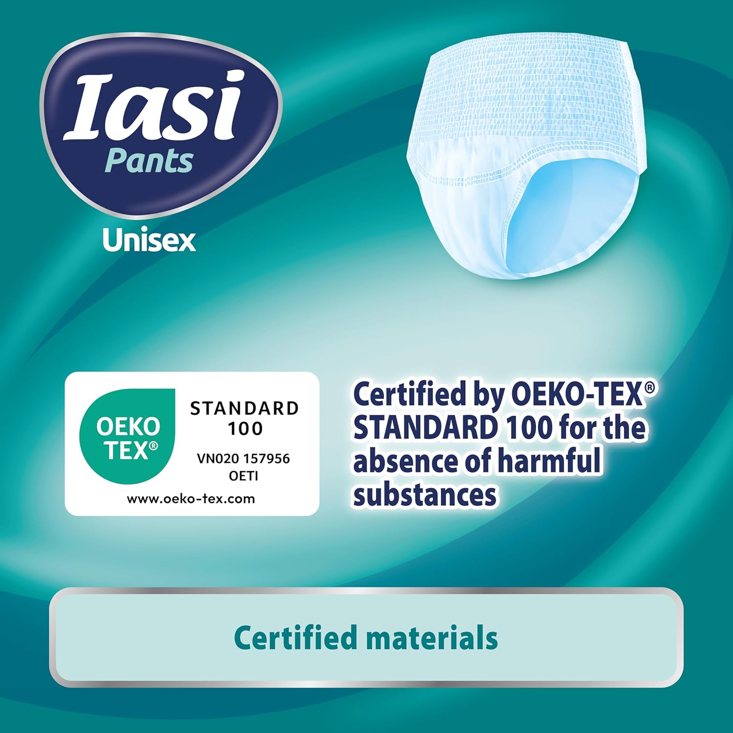 Super thin and discreet: Thanks to Comfy-Fit technology, the range of Iasi incontinence absorbent underpants are comfortable and discreet, with all the absorbency of the most bulky products. Anatomical shape and white color.
