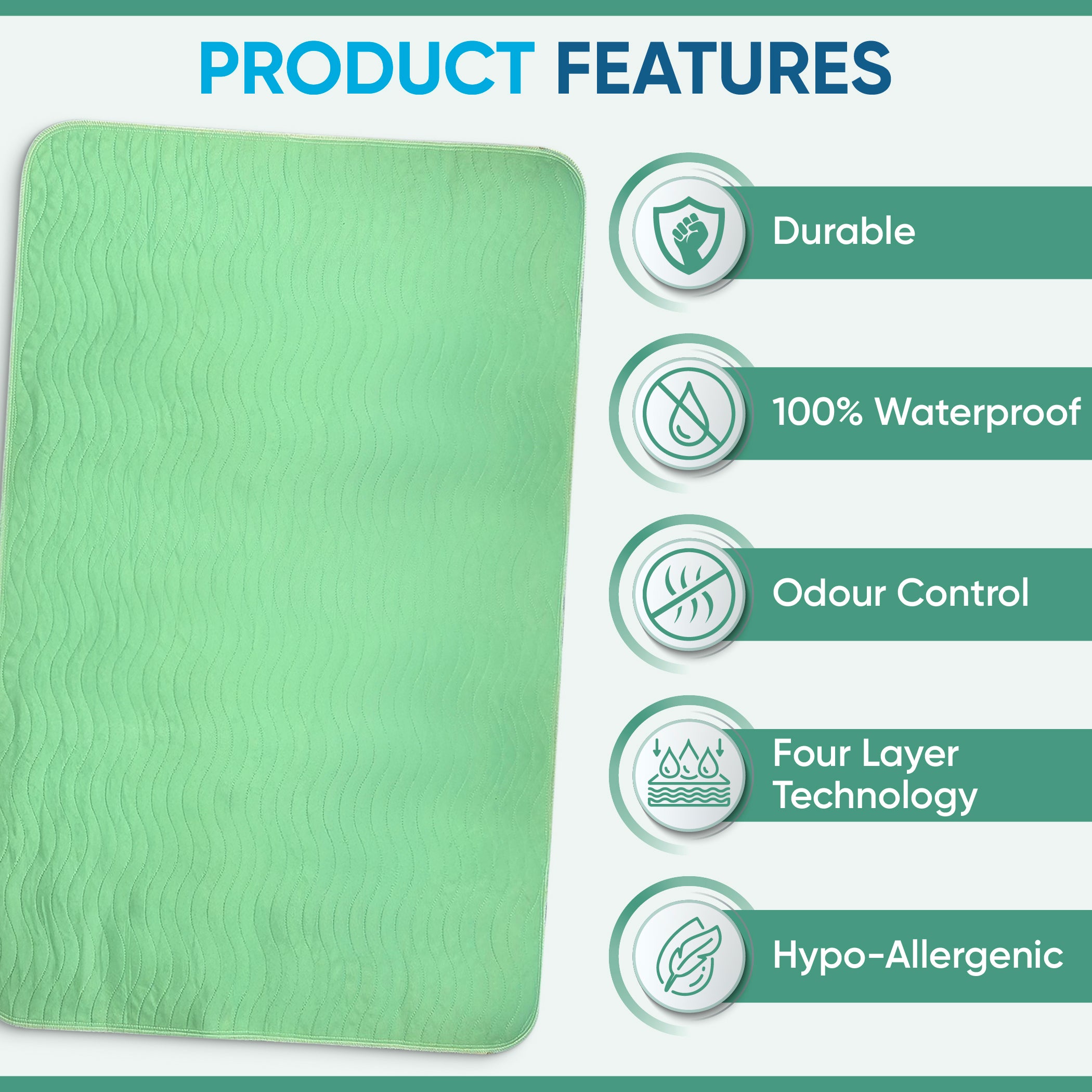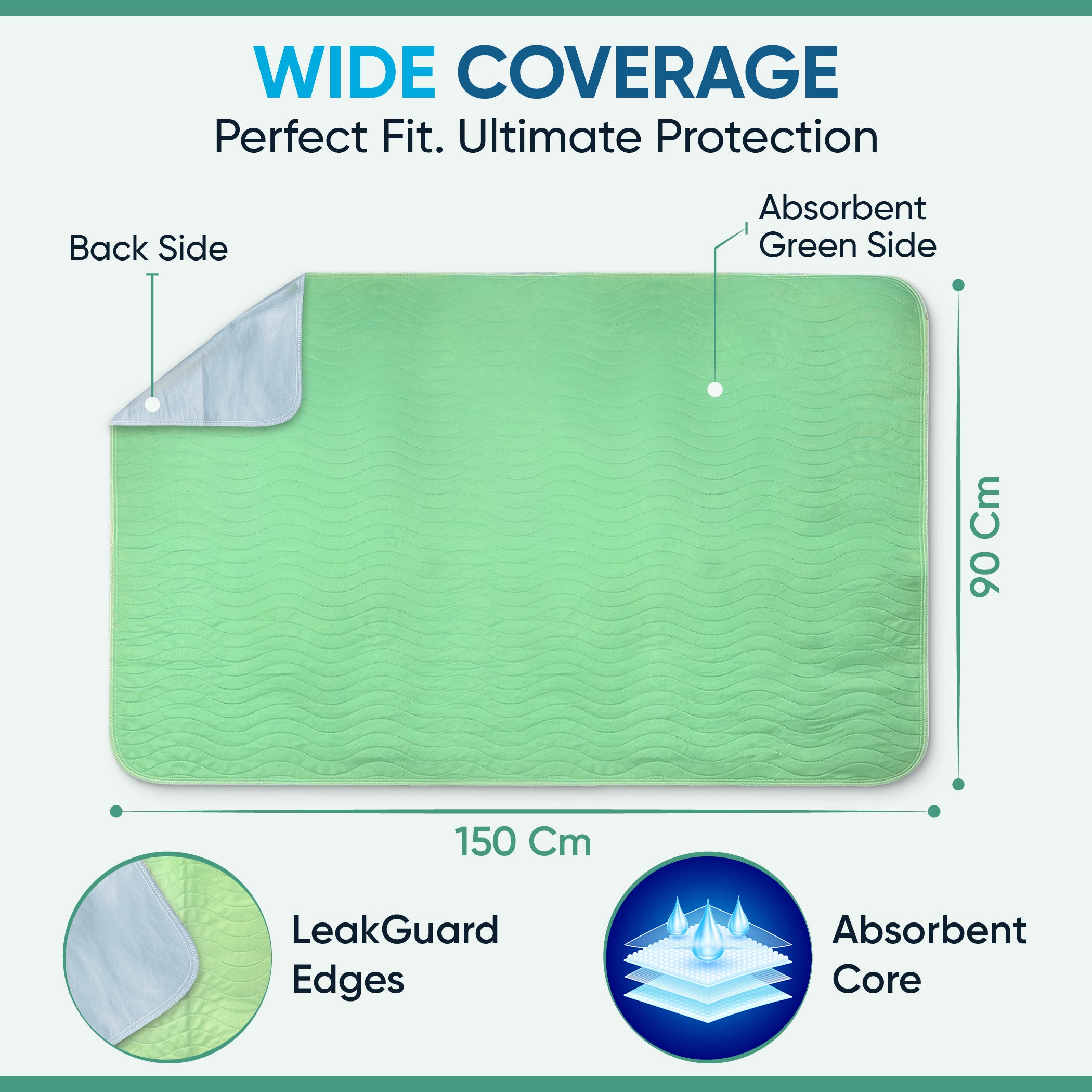Green Incontinence Bed Pads: 150x90 cm, Washable, without Tucks/Flaps (Qty:2)