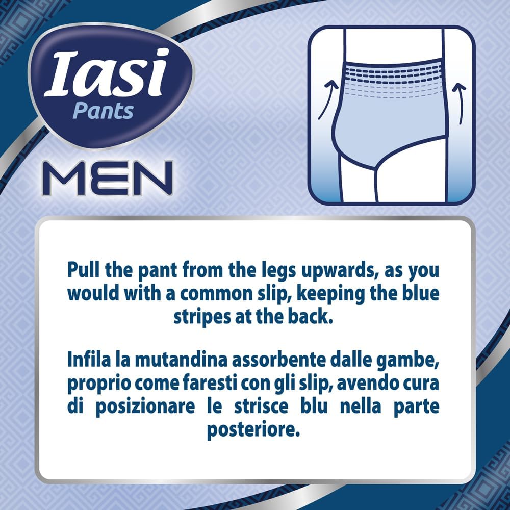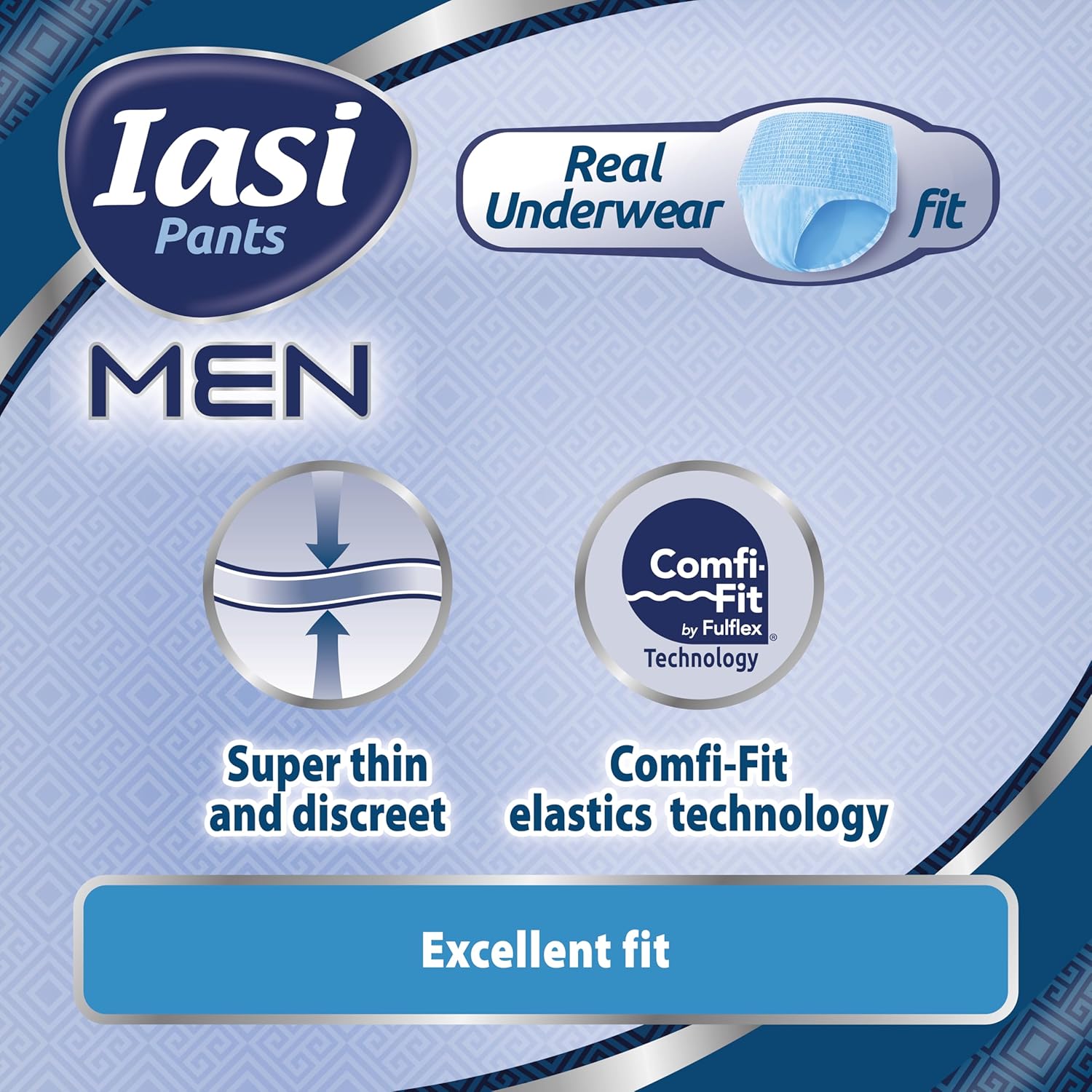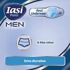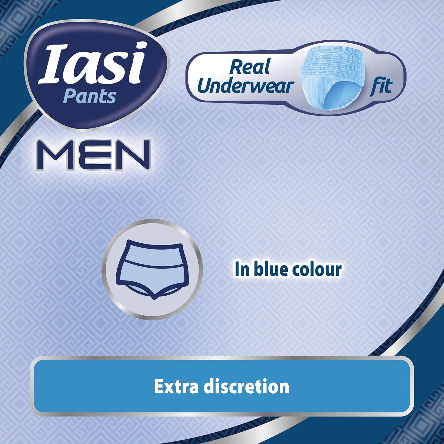 Super thin and discreet: Thanks to Comfy-Fit technology, the range of Iasi incontinence absorbent underpants are comfortable and discreet, with all the absorbency of the most bulky products. Anatomical shape and male blue color