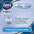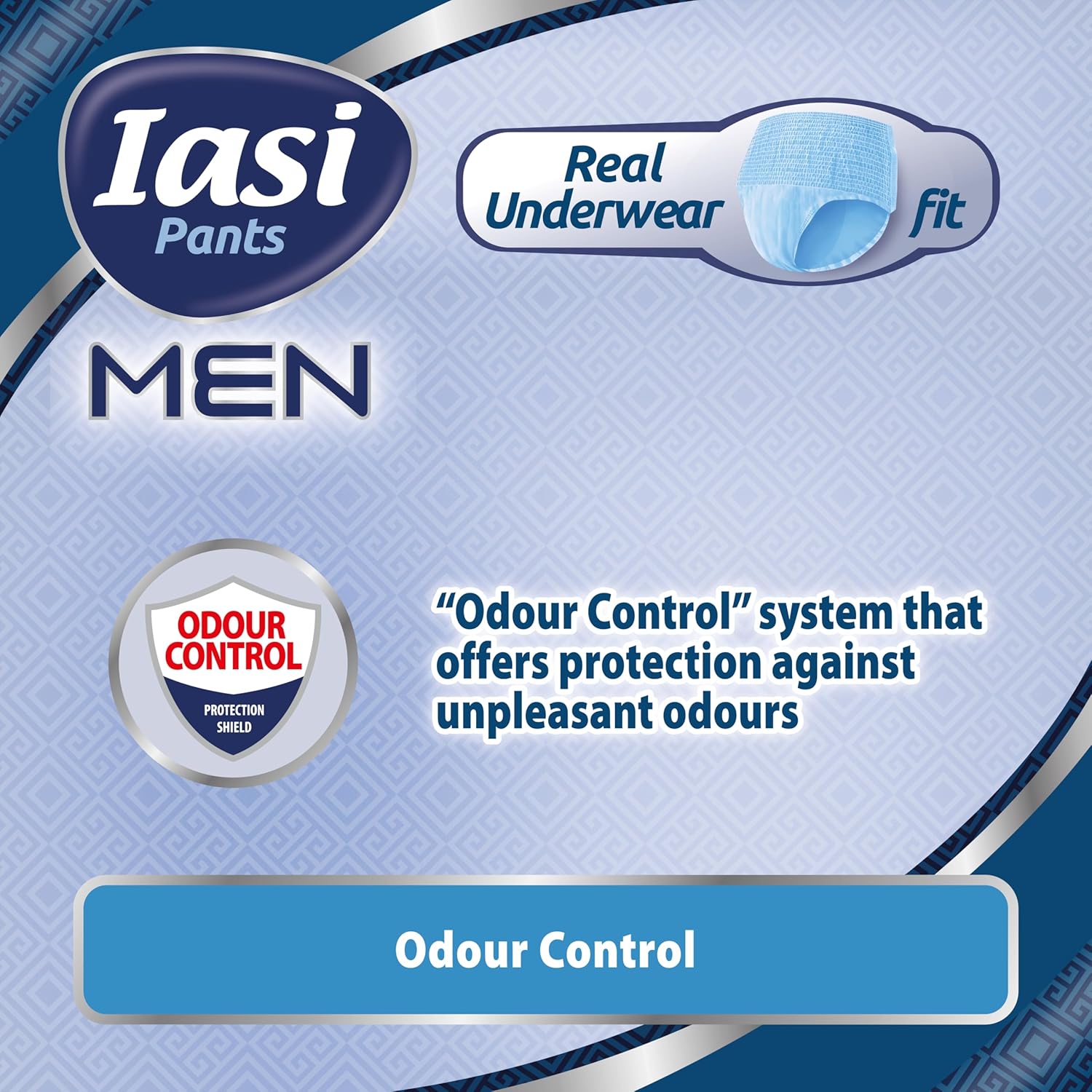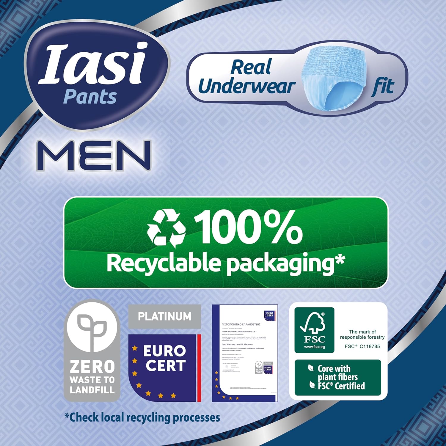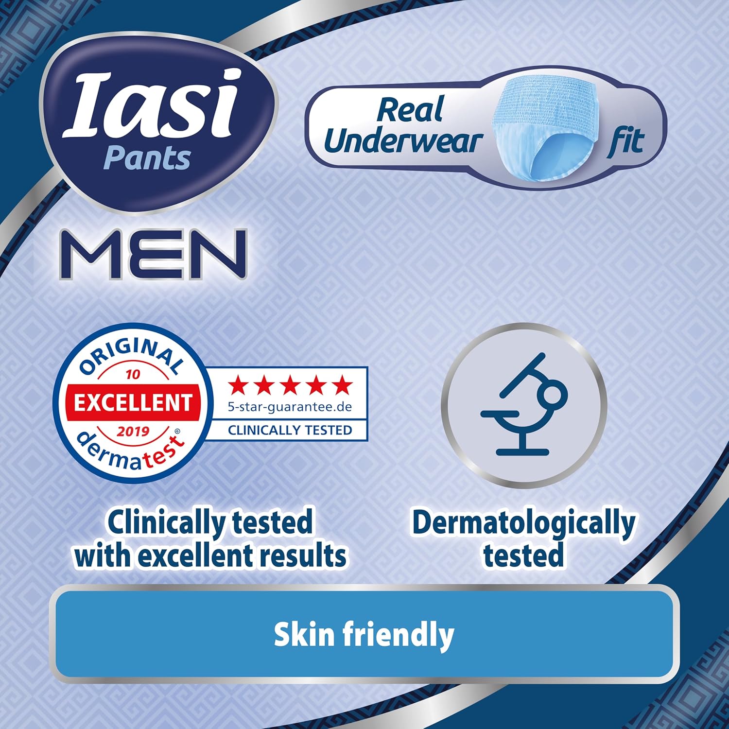 Super thin and discreet: Thanks to Comfy-Fit technology, the range of Iasi incontinence absorbent underpants are comfortable and discreet, with all the absorbency of the most bulky products. Anatomical shape and male blue color