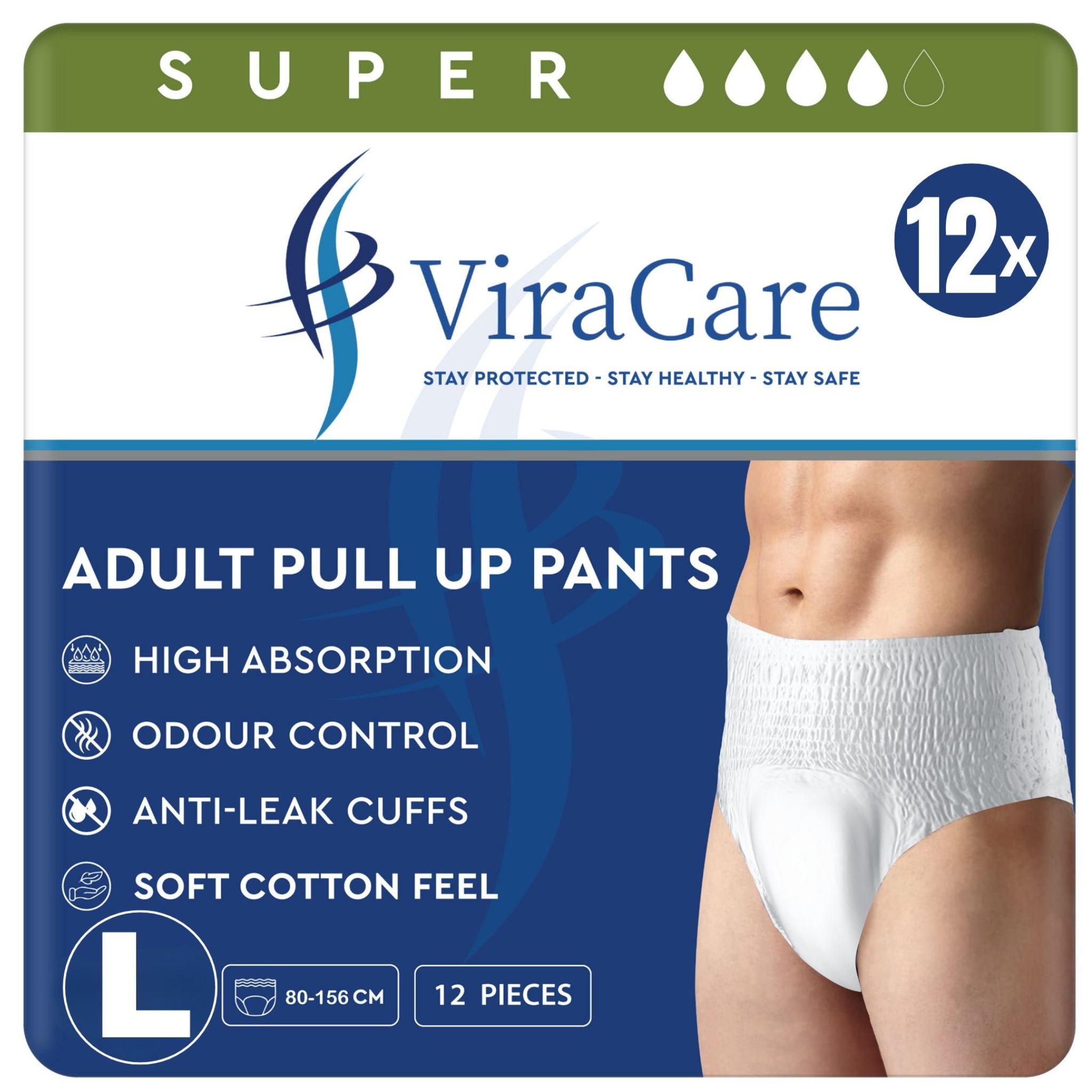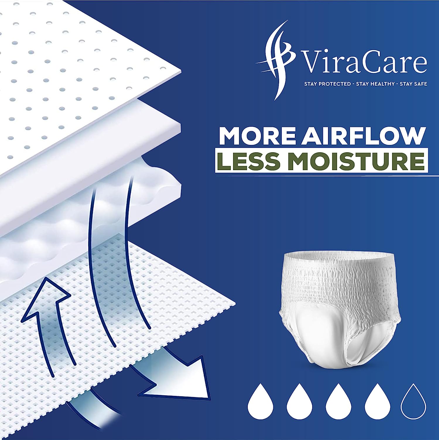 SOFT & BREATHABLE: ViraCare pull-up pants for adults includes a cotton top sheet, which is designed for ultimate comfort. Our adult incontinence pull-up pants are breathable, soft, and include a full-rise soft-stretch waistband providing a snug fit.