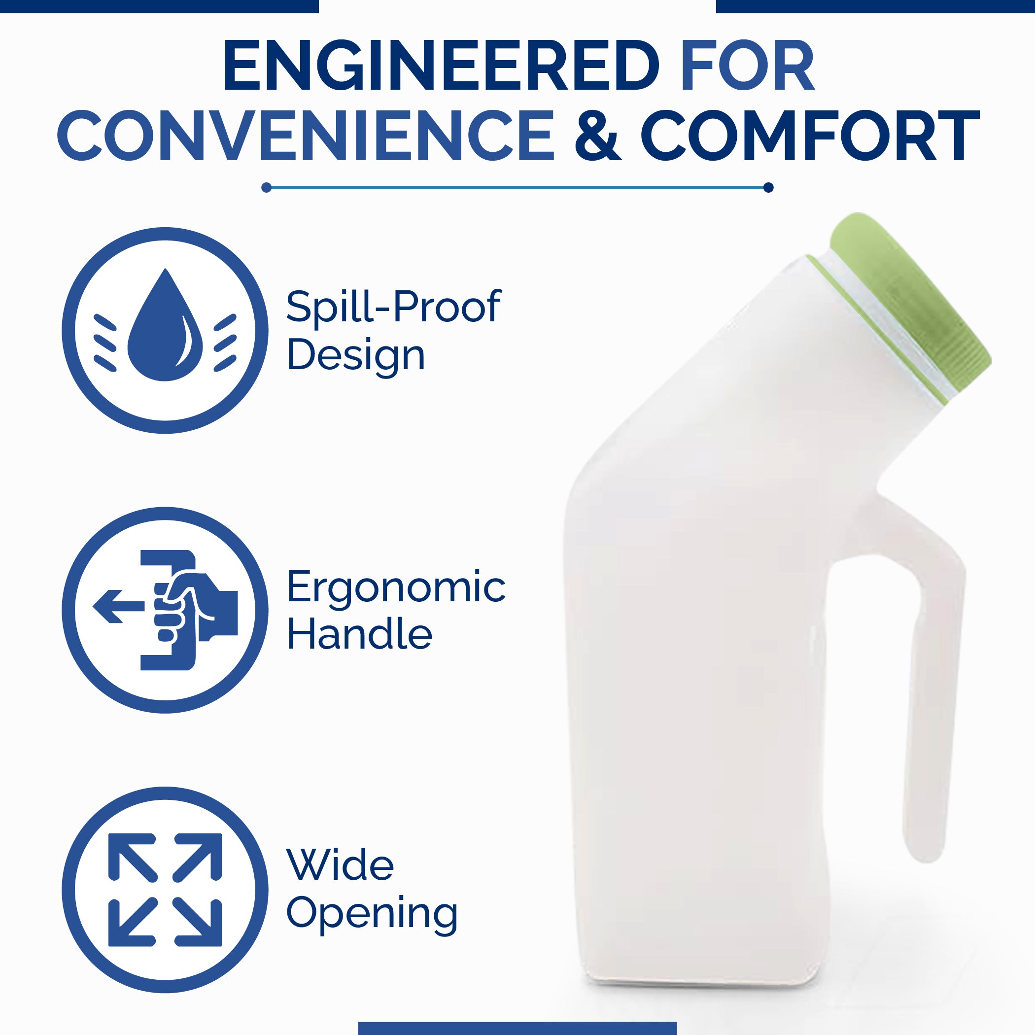 CONVENIENT & SPILL-PROOF DESIGN: Our urine bottles unique design combines a wide, comfortable opening with a secure, leak-proof seal. Enjoy a mess-free use of our male urinal in any condition. The ergonomic handle ensures easy handling and control.